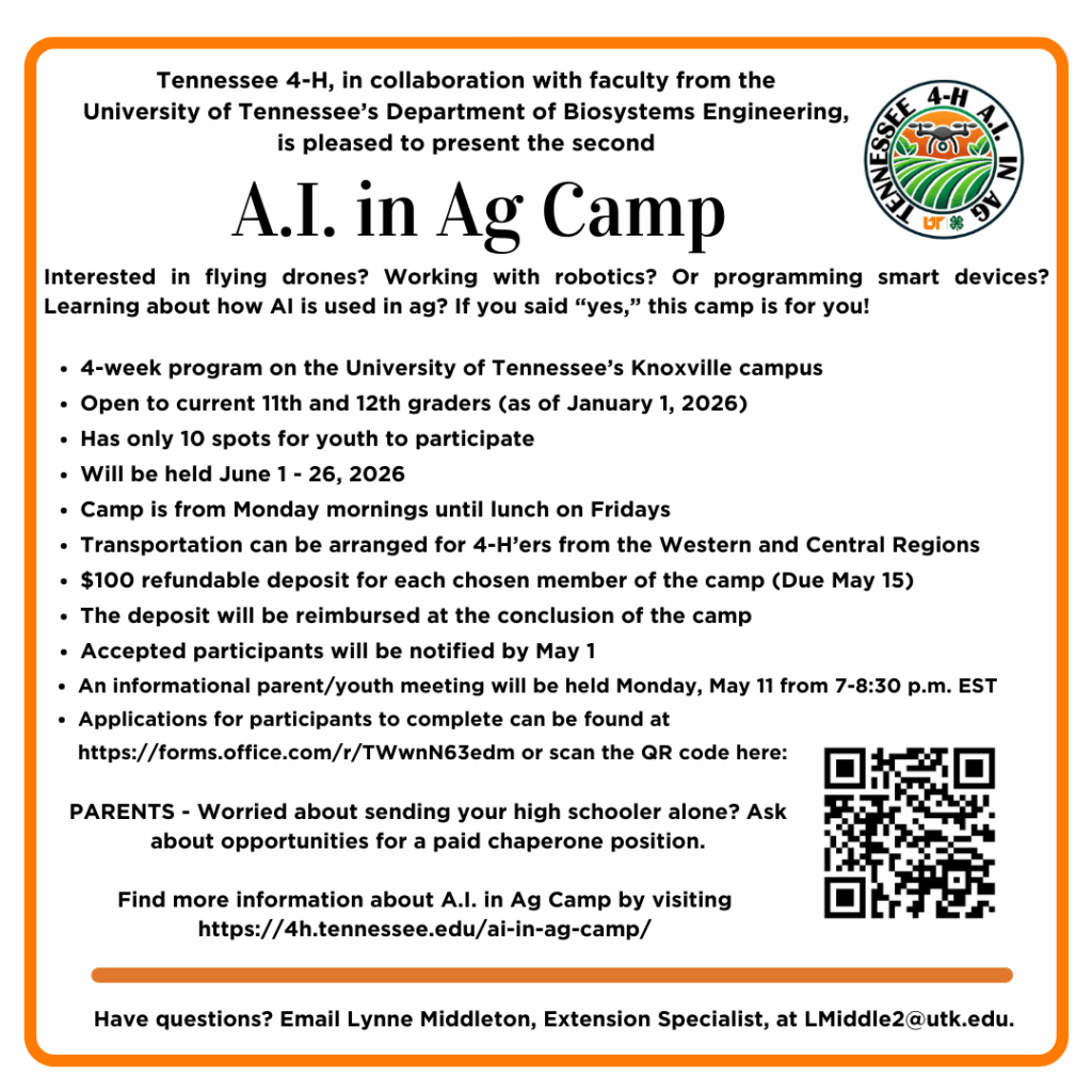This summer, a Smart Ag Camp will be held on the UT Knoxville campus weekdays from June 1 to 26 for ten youth in grades 11 or 12. Participants will stay in the UT dorms and receive instruction from UT faculty, scientists, and specialists. They will work in teams on smart ag projects, hands-on engineering projects, and begin preparation as a drone remote pilot with hopes of creating a drone racing team.